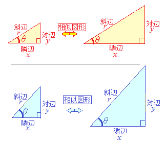 上の図で,左側に描いた水色の三角形は「直角三角形」だから,その辺の長さの比は三角比になります.
